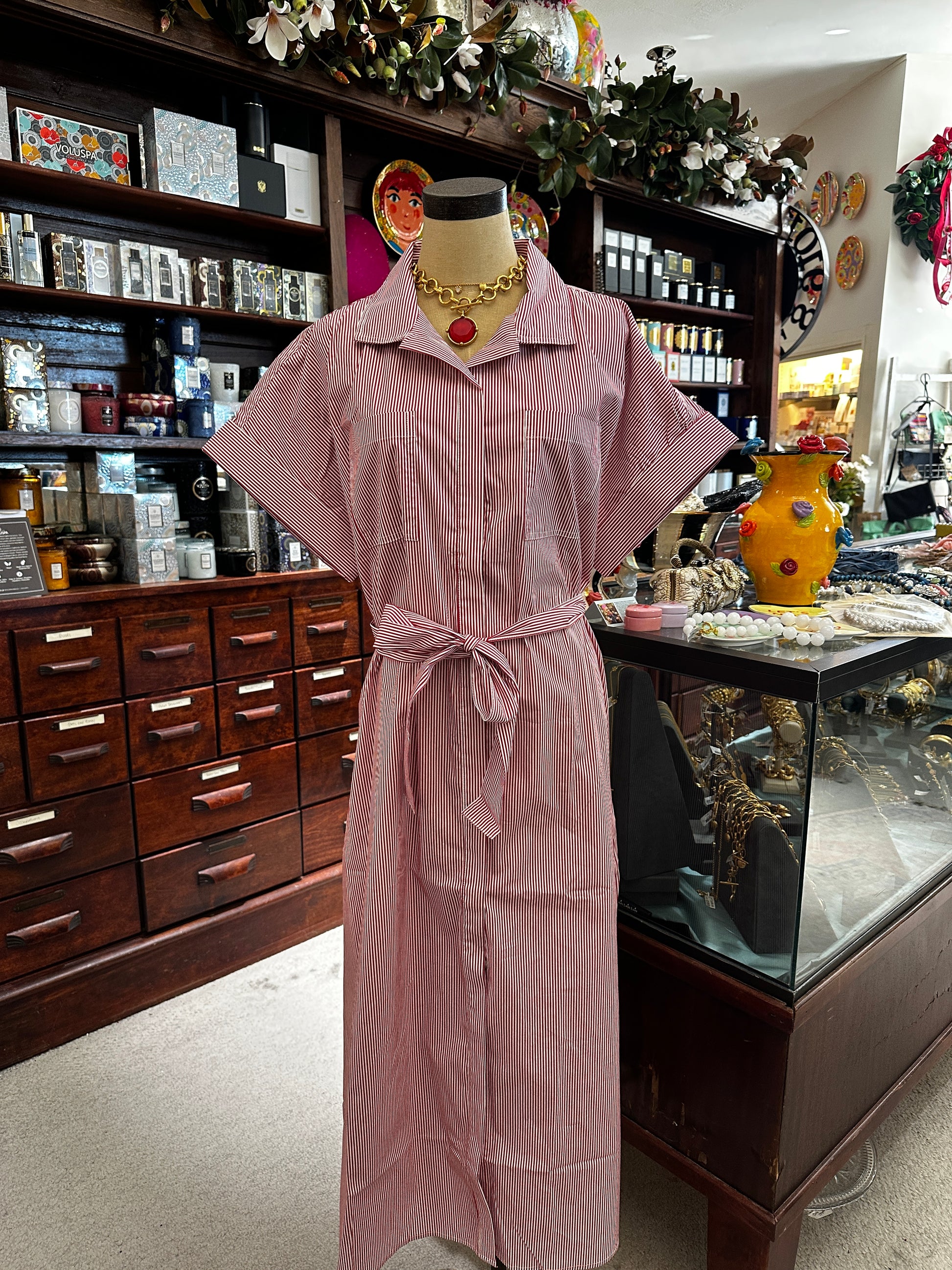 Designed with bold red stripes, this midi dress showcases a structured collar and adjustable tie waist that enhances your shape. Its polished look and comfortable length make it an easy choice for stylish day-to-night dressing.