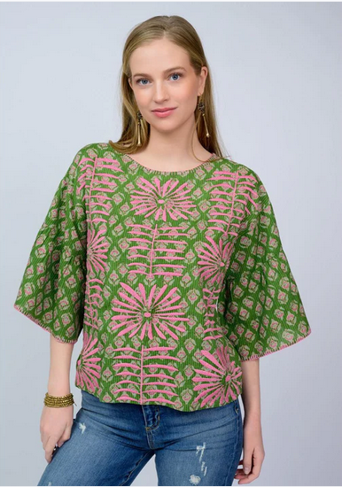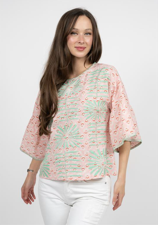 ROUND NECK EMB EDGES PUFF SLEEVE
