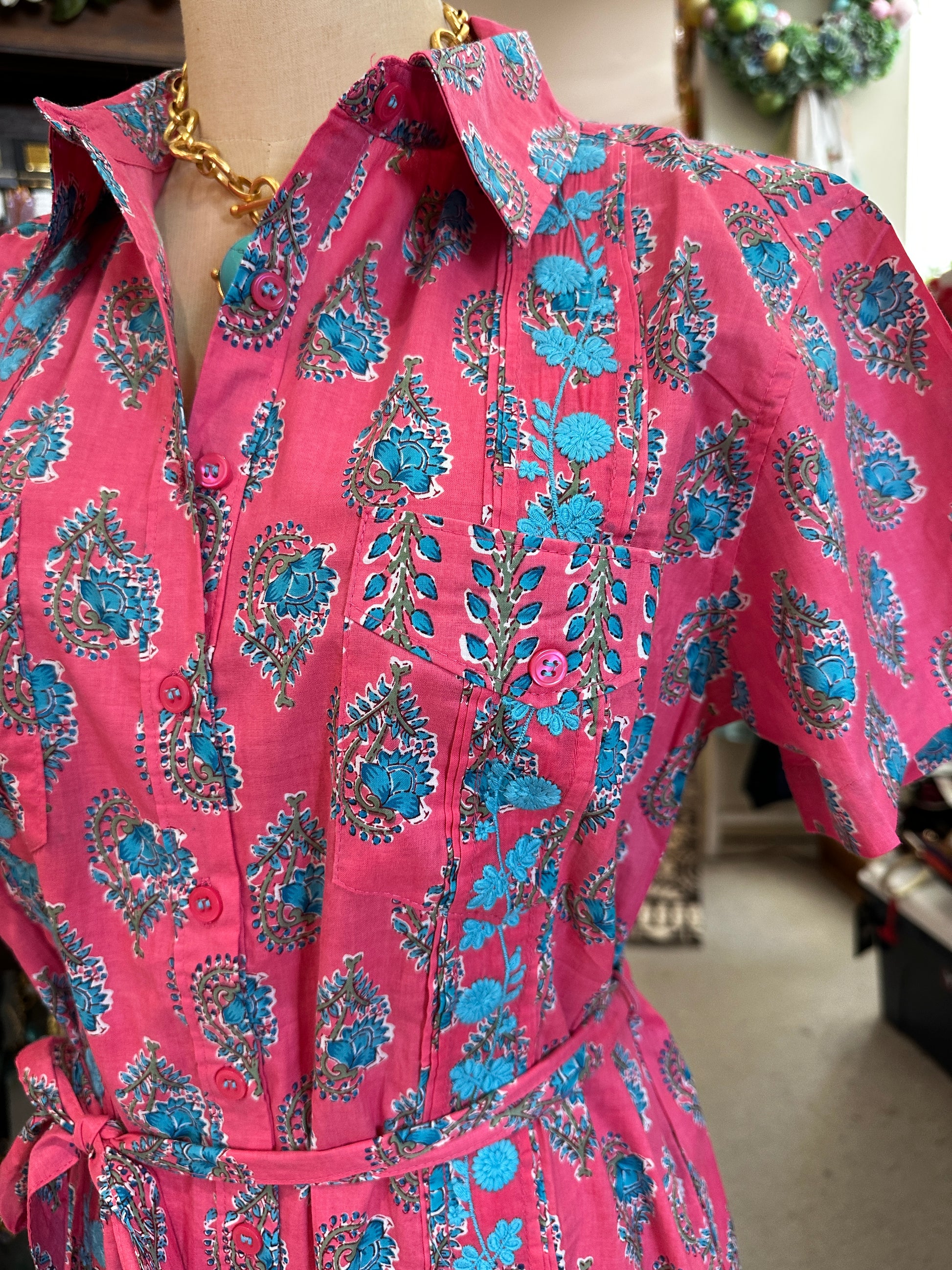 Turquoise and Pink: This eye-catching pink dress features a vibrant turquoise paisley print paired with the same beautiful embroidery and waist detail as its gingham counterpart. The colorful floral pattern adds a fresh, feminine feel while the embroidery brings unique boutique charm.