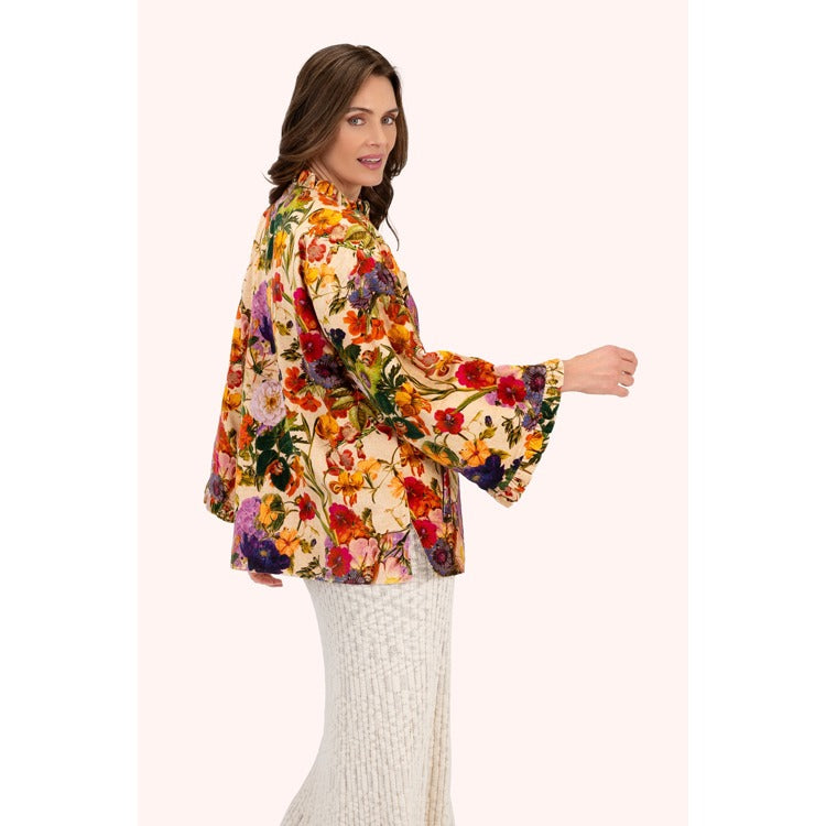 Turn heads and twirl in style with this stunning cream jacket, featuring whimsical bell sleeves and a splash of floral print that’s anything but basic and ruffle detail down the front and around the collar. Perfect for brunch dates, gallery strolls, or whenever you feel like blooming a little brighter. Lightweight, flattering, and full of charm — this jacket adds just the right touch of flair to any outfit.
