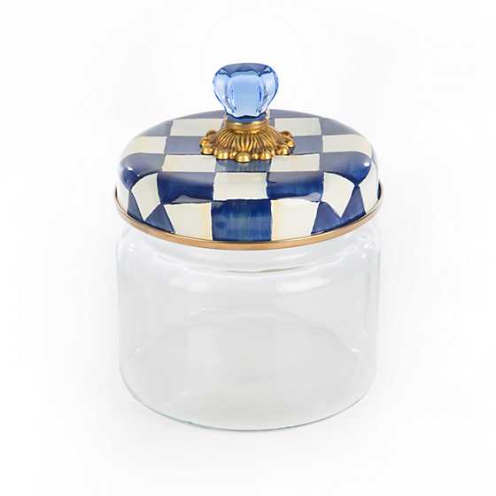 Glass canister and heavy gauge enameled steel lid rimmed in bronzed stainless steel with glass and brass accents.