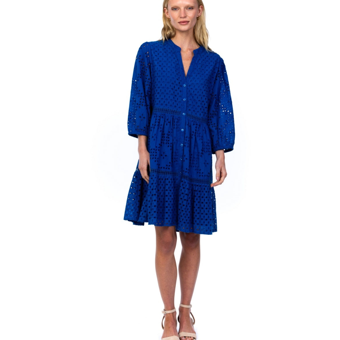 Mandarin neck short dress with tiered skirt and 3/4 length sleeves