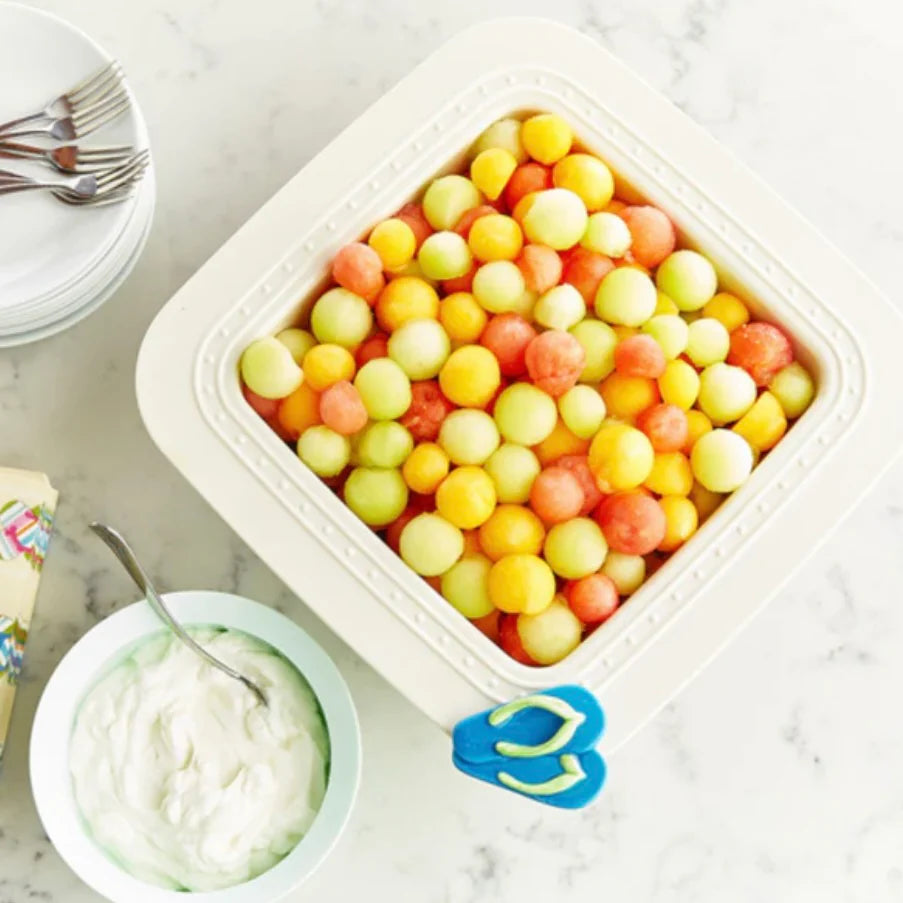 A pair of colorful, hand-painted ceramic flip-flops intended to bring a summer or beach theme to table settings.