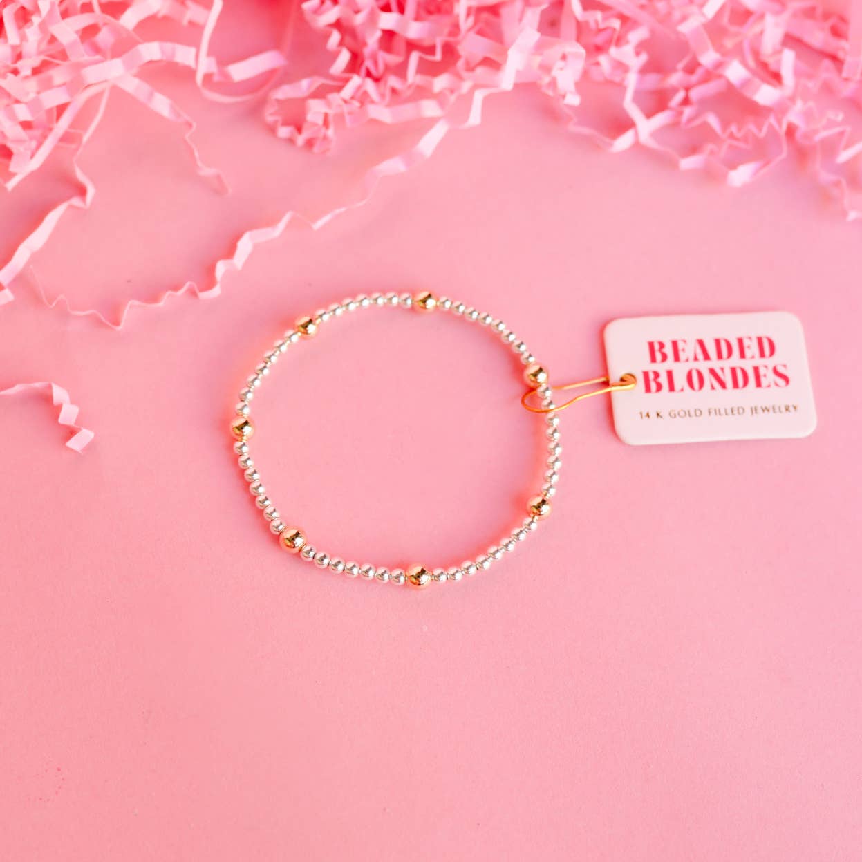Beaded Blondes silver stackable beaded bracelets with 3mm + 5mm pattern.