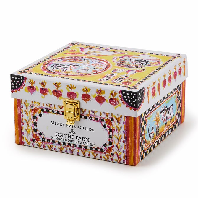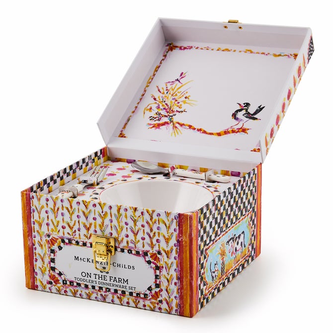 Includes 1 compartment plate (8.5" dia.), 1 bowl (6.5" dia.), 1 cup (3" dia.), 1 fork (5.5" long), 1 spoon (5.5" long), and 1 box.