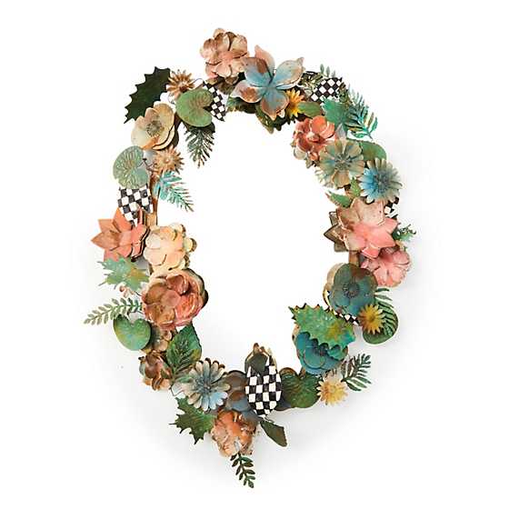 Frame constructed of iron and engineered wood. Hand-painted aluminum floral details. Reflective glass surface. Keyhole hanger.