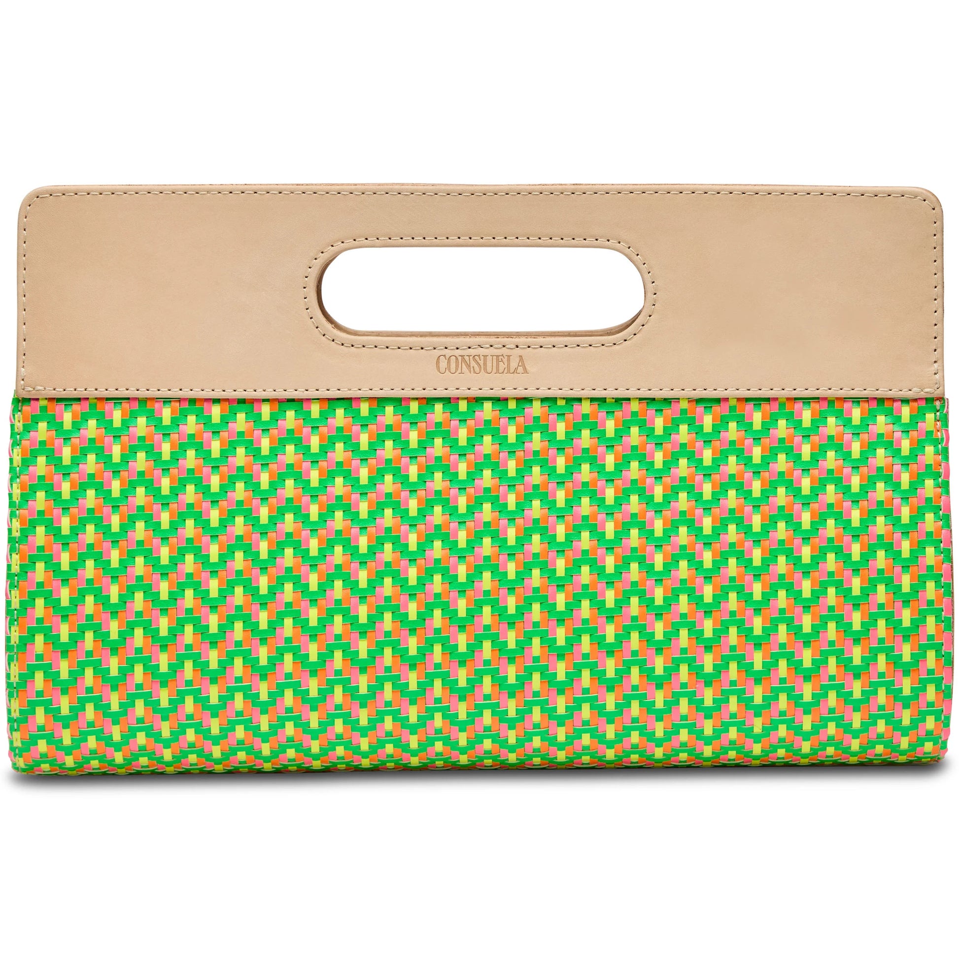 Supercharge your day with our newest clutch! This Diego leather-trimmed, hand-held clutch has plenty of storage for a bold and chic style.