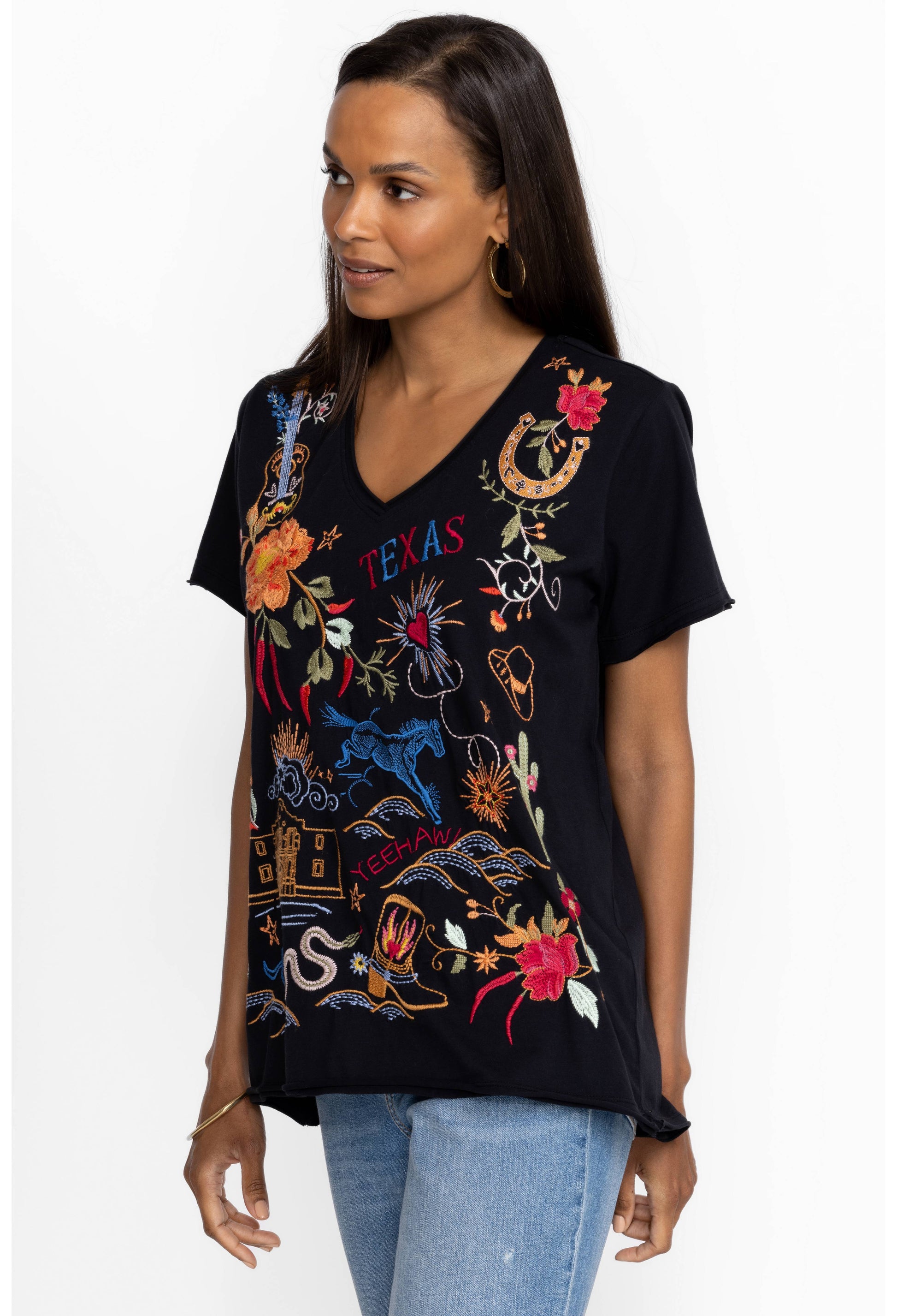 Casual comfort in a classic silhouette, the Texas Cap Sleeve Tee is a celebration of the Lone Star State. Boasting an easy bias cut and a flattering V-shaped neckline this tee features iconic Texas imagery in carefully crafted placement embroidery.
