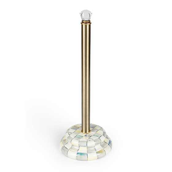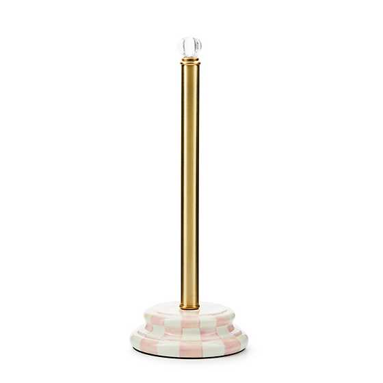 Made of heavy-gauge steel and decorated with hand-painted Courtly Check and a glass knob finial, it holds three rolls.