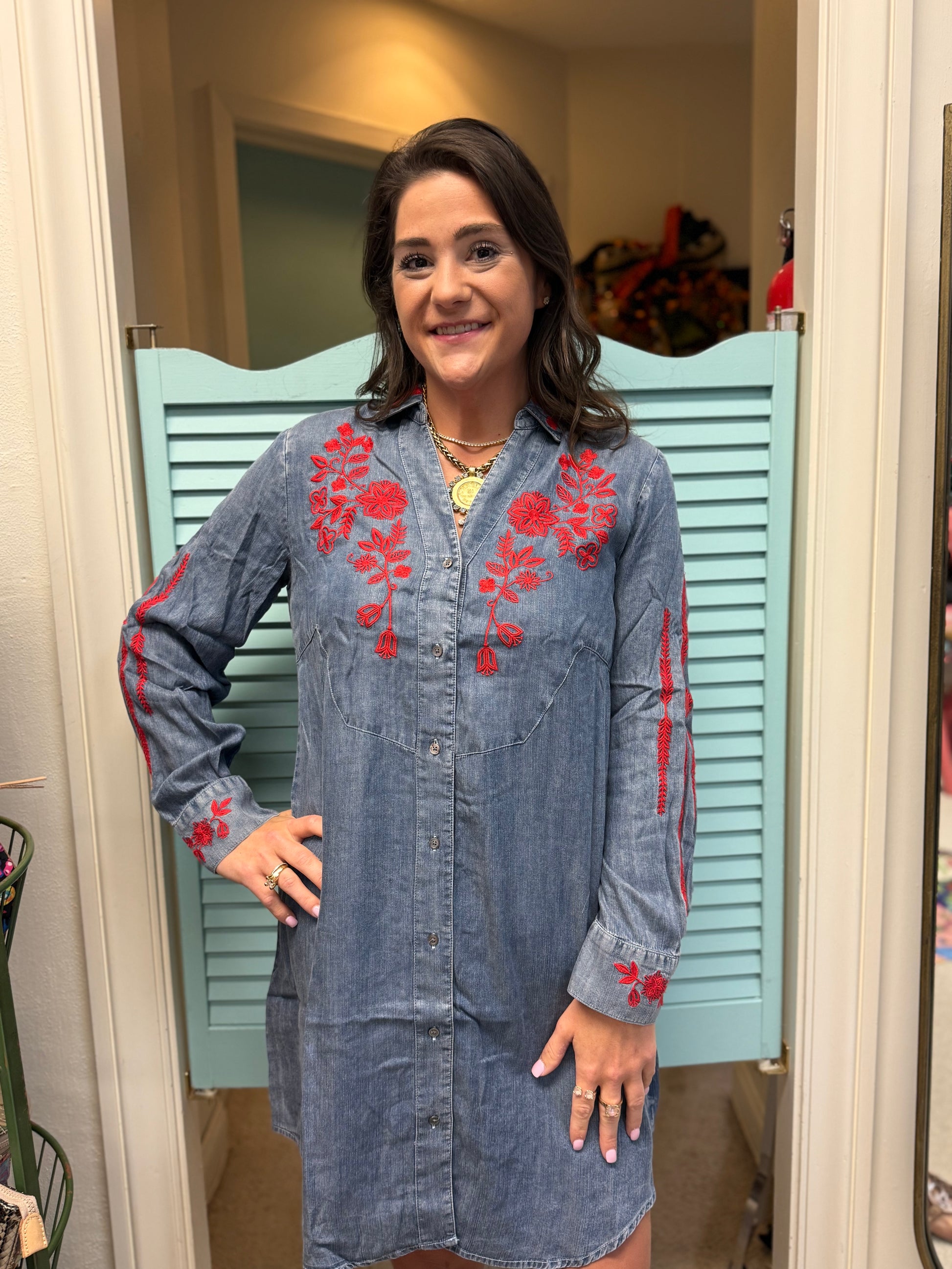 A fresh take on classic denim—this 3/4 sleeve button-down dress is beautifully detailed with striking red embroidery.