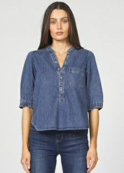 This fun and lightweight top boasts a denim button-up neckline and playful three-quarter sleeves for a light, flowy feel.