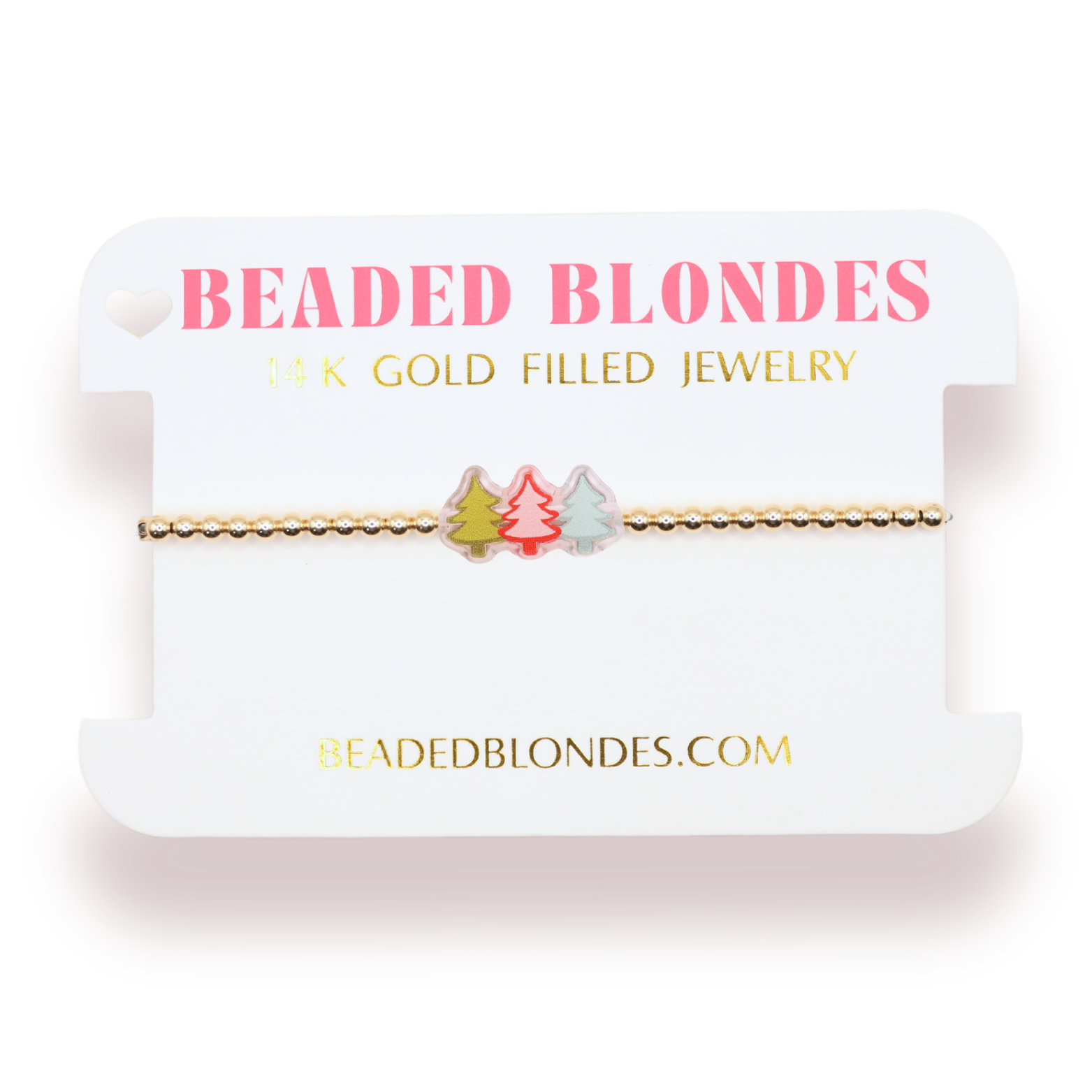 Part of the Beaded Blondes Holiday Collection. Our Tree Trio Holiday Bracelet is available on gold or sprinkle making it perfect to add to your stack for the holidays.