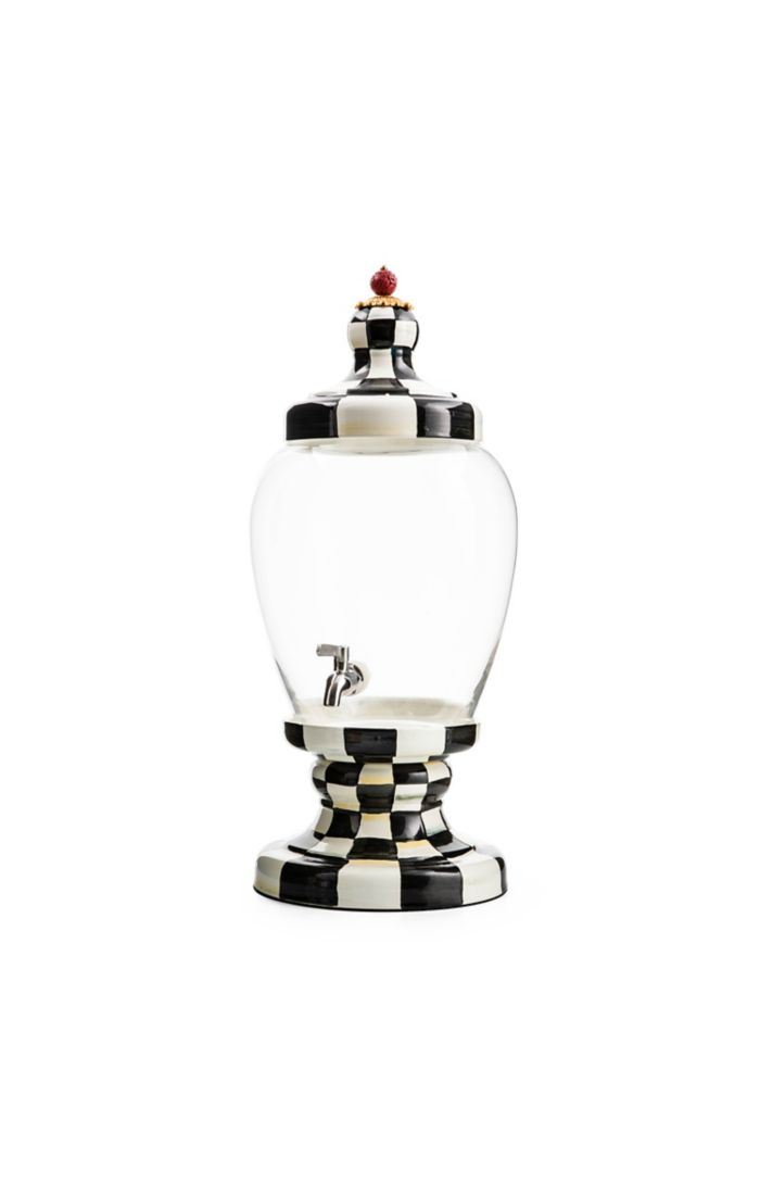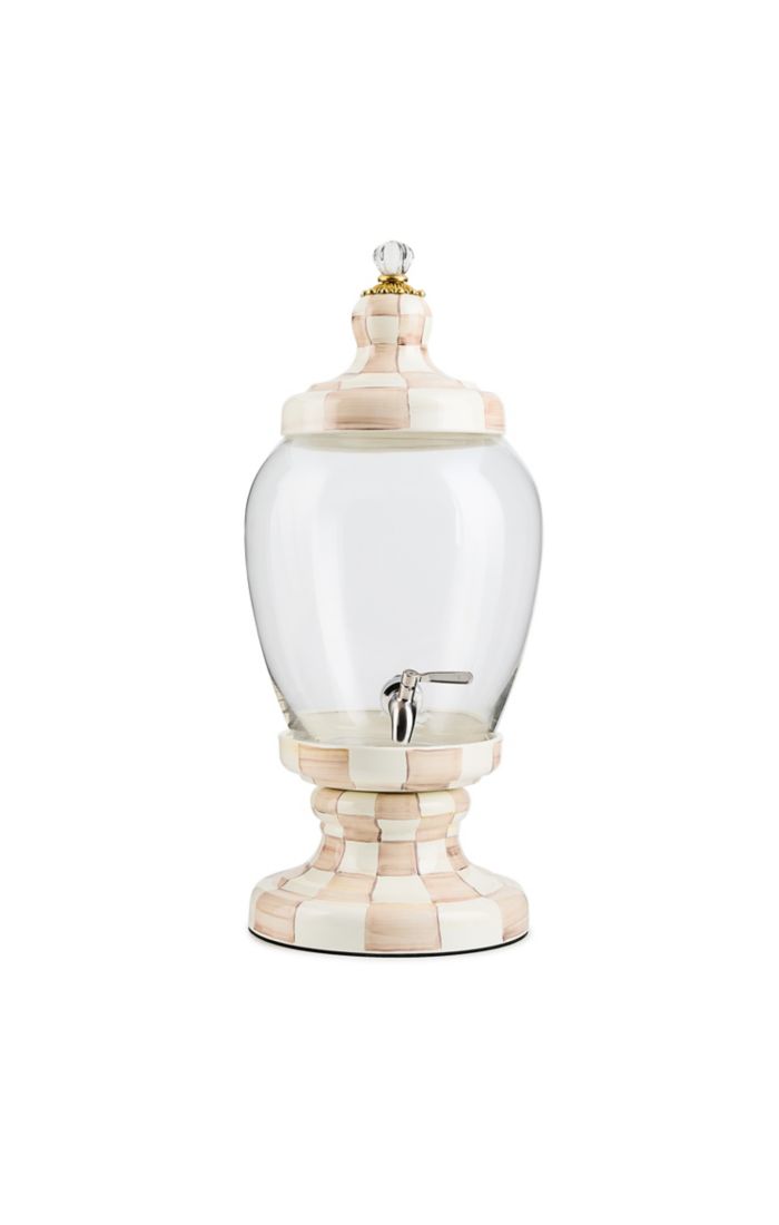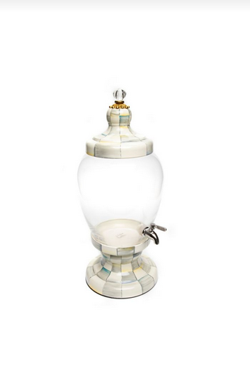 Generously sized to hold three gallons, its white enamel lid is decorated with hand-applied Flower Market transfers with a glass dispenser and stainless-steel spout.