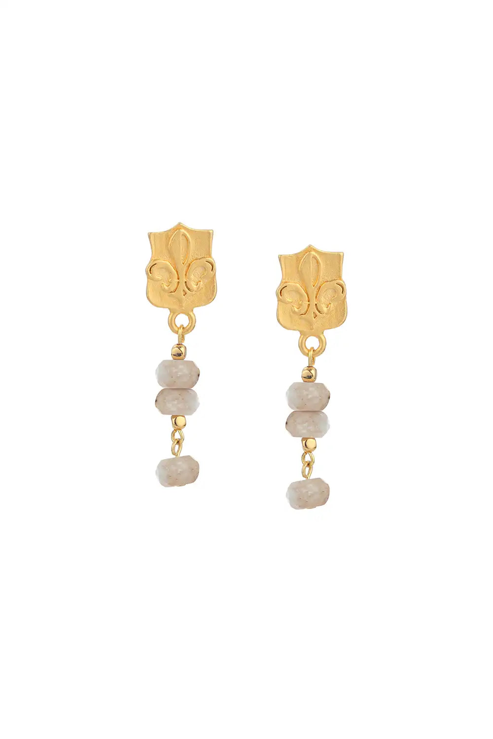 These earrings feature gold Fleur-de-Lis pendant studs with a delicate Riverstone and gold heishi dangle.
